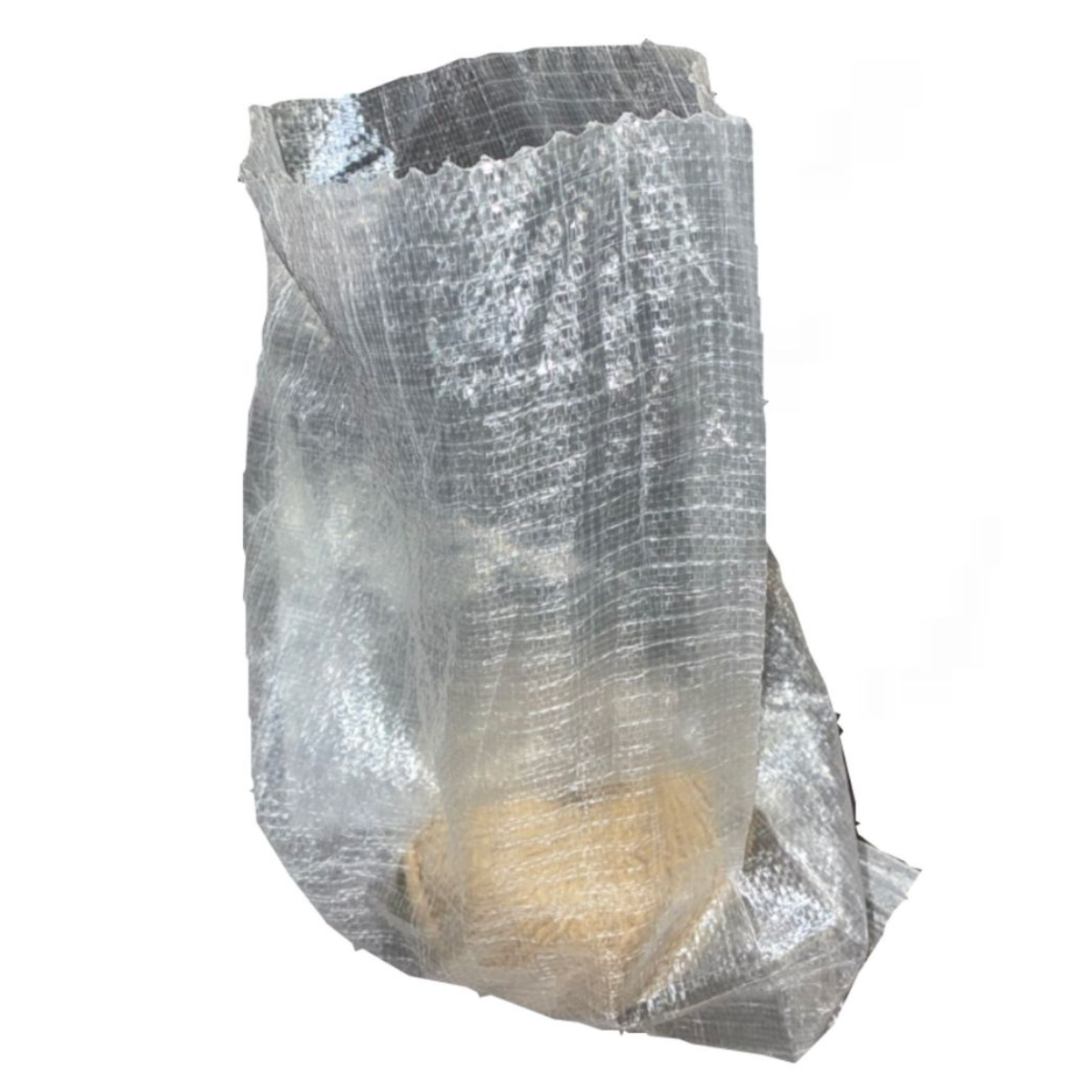 Costal transparente de plástico, ideal para el envasado, almacenamiento y transporte de productos agrícolas, comerciales e industriales, permitiendo una fácil visualización del contenido.