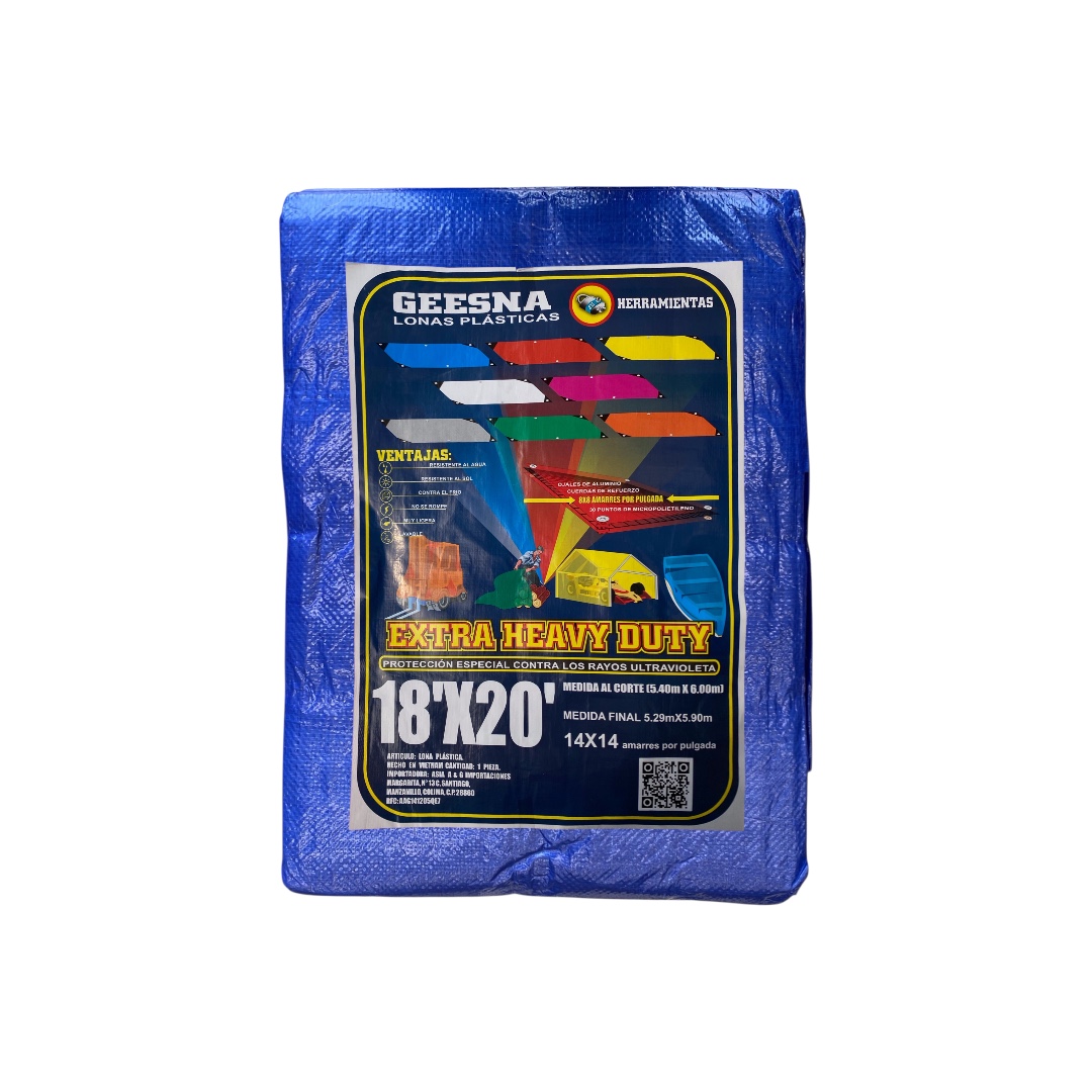 Lona plástica Geesna Extra Heavy Duty 5x6m, ultra resistente, impermeable y con protección UV para una mayor durabilidad al exterior. Ideal para cubrir autos, motos, maquinaria, materiales de construcción, herramientas, terrazas, campamentos, cargas en transporte y áreas expuestas a la lluvia o al sol. Perfecta para trabajos rudos y usos domésticos o industriales.