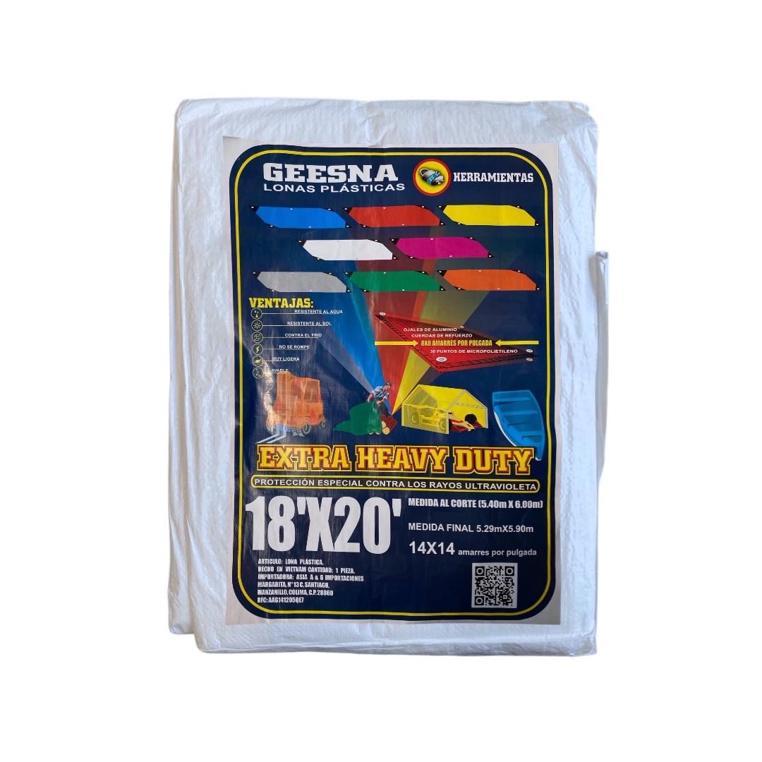 Lona plástica Geesna Extra Heavy Duty 5x6m, ultra resistente, impermeable y con protección UV para una mayor durabilidad al exterior. Ideal para cubrir autos, motos, maquinaria, materiales de construcción, herramientas, terrazas, campamentos, cargas en transporte y áreas expuestas a la lluvia o al sol. Perfecta para trabajos rudos y usos domésticos o industriales.