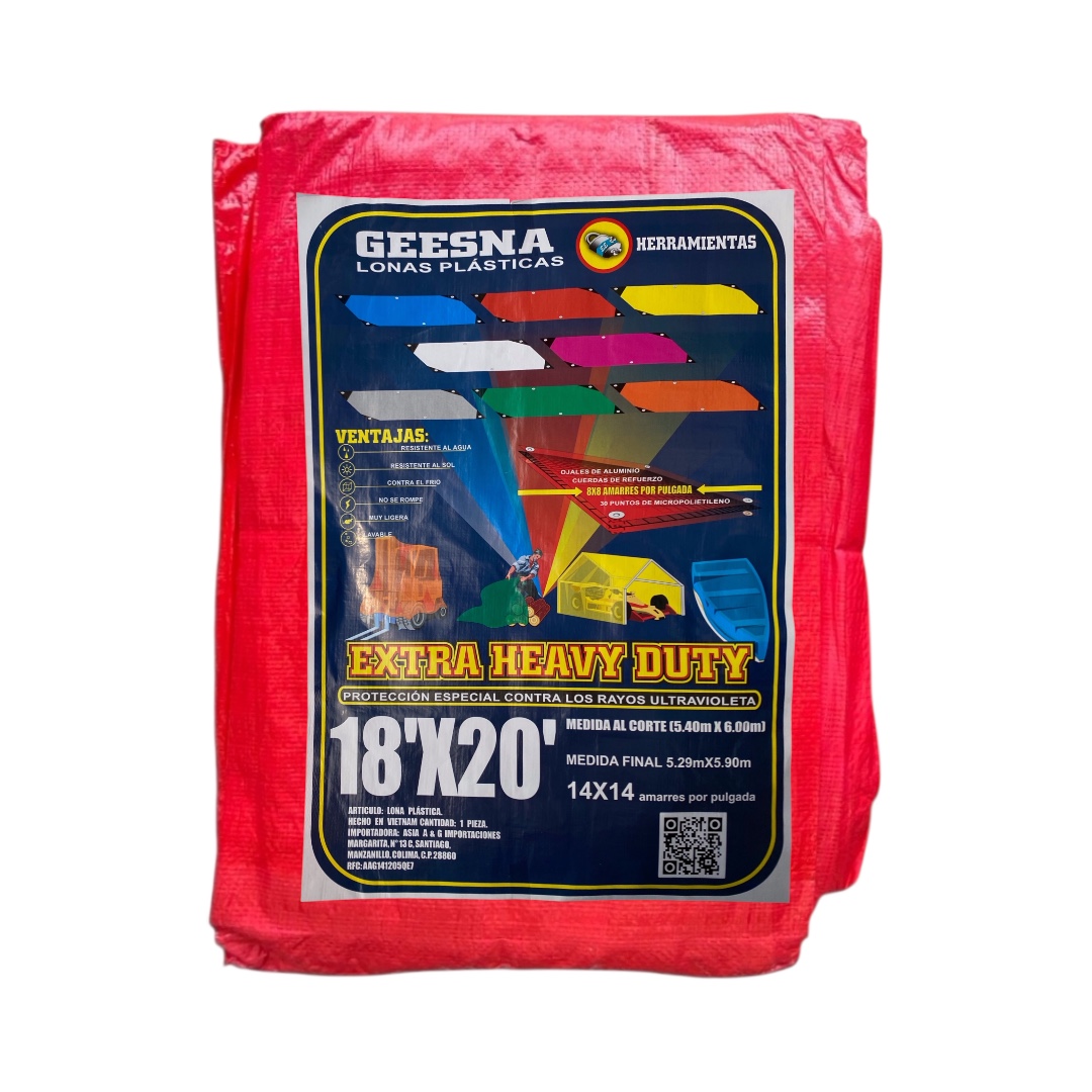 Lona plástica Geesna Extra Heavy Duty 5x6m, ultra resistente, impermeable y con protección UV para una mayor durabilidad al exterior. Ideal para cubrir autos, motos, maquinaria, materiales de construcción, herramientas, terrazas, campamentos, cargas en transporte y áreas expuestas a la lluvia o al sol. Perfecta para trabajos rudos y usos domésticos o industriales.